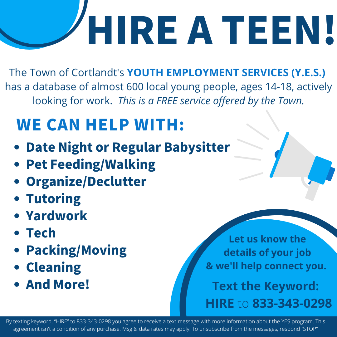 The Town of Cortlandt’s Youth Employment Services (Y.E.S.) can help you find local high school students who want to work short or long term. Looking for a date night babysitter? Someone to walk your dog or feed your pets while you’re away? Help with yard work this fall? Let us know the details of your job we’ll help connect you. Your personal information is kept private, and we only give your application instructions to those expressing the desire to apply.