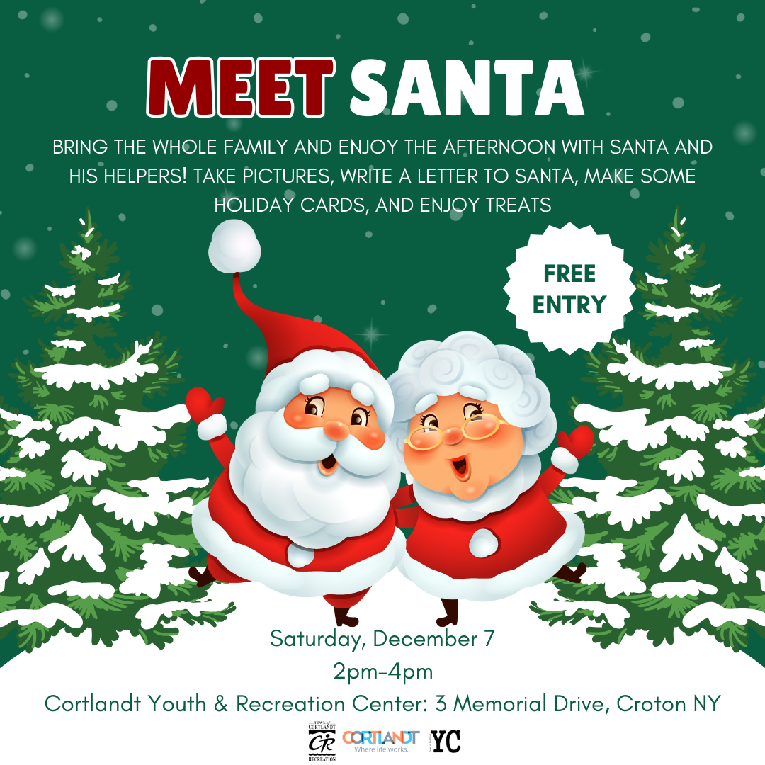 Bring the whole family and enjoy the afternoon with Santa, Mrs. Claus and their helpers! Take pictures, write a letter to Santa, make holiday cards and enjoy treats from Mrs. Claus’ kitchen! No registration required. Visit www.townofcortlandt.com/yc for additional program information.
