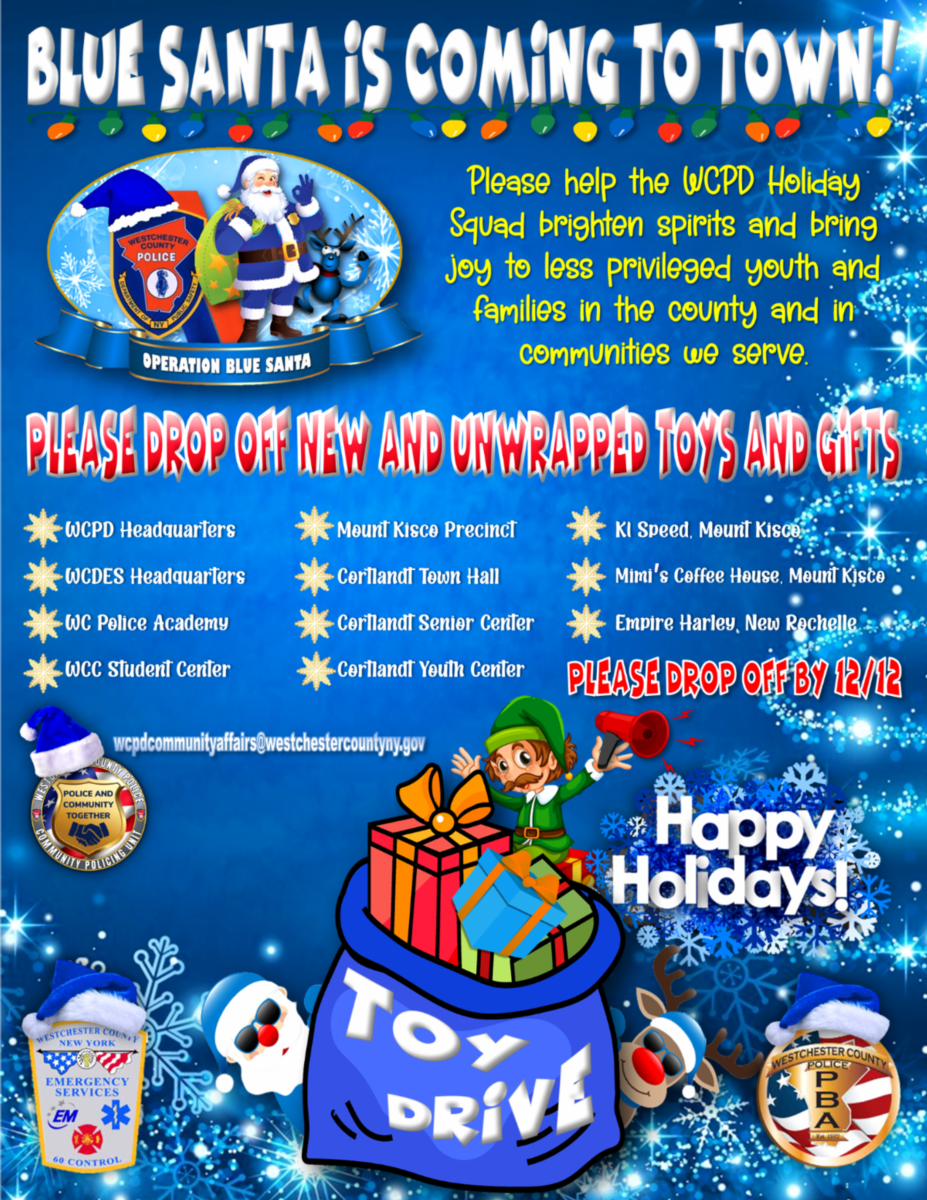 Please help the Westchester County Police Department Holiday Squad brighten spirits and bring joy to less privileged youth and families in the county and in communities they serve. We are calling upon our generous community to help us collect new, unwrapped toys for those in need. Your support will make a difference! Let's come together as a community and bring smiles to the faces of those who need it the most.