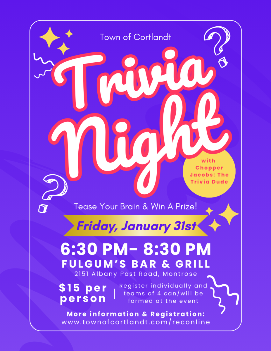 Tease your brain & win a prize with Chopper Jacobs: The Trivia Dude and the Town of Cortlandt Recreation Departmenton Friday, January 31st!