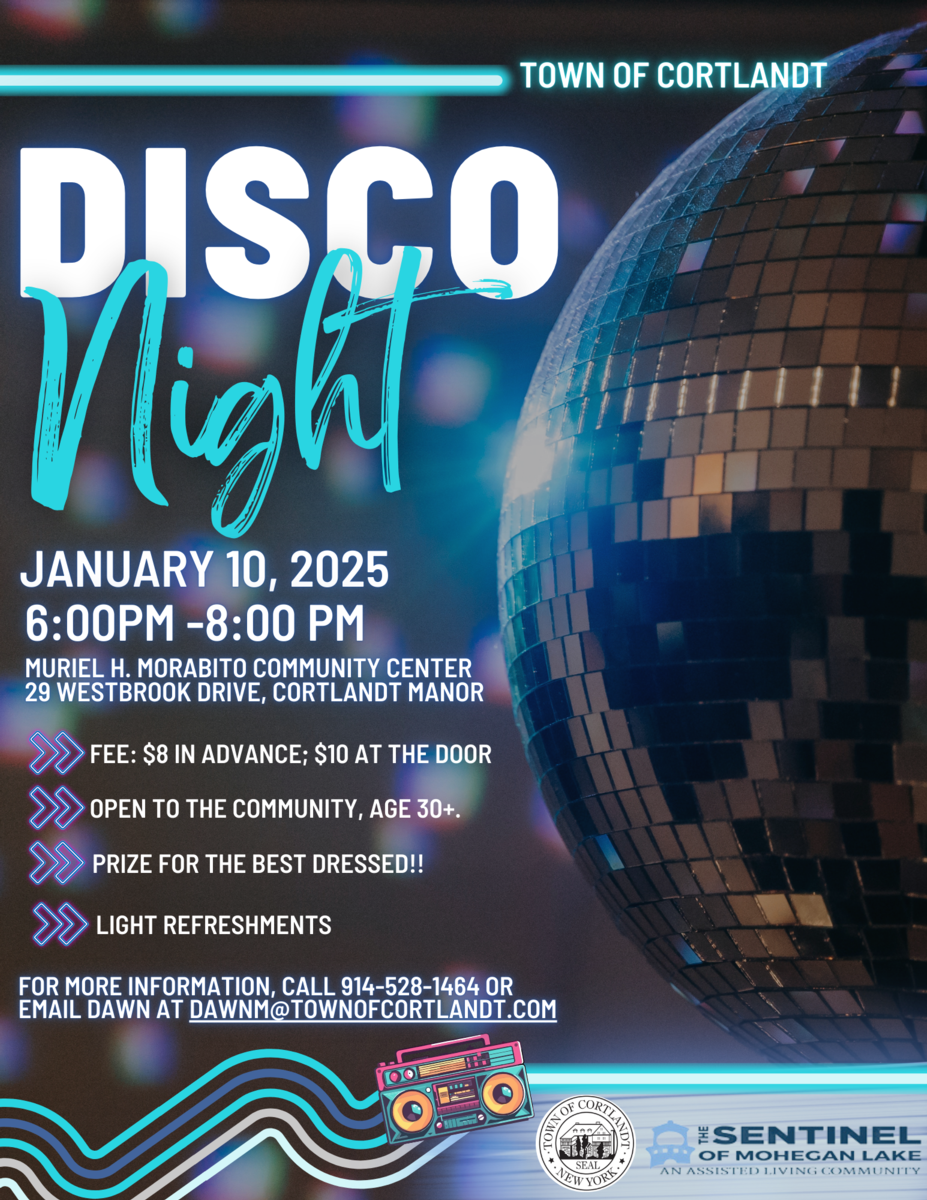Get ready to groove! Join us for our Disco Night at the Muriel H. Morabito Community Center on Friday, January 10th at 6PM-8PM. This is open to the Cortlandt Community, age 30+. There will be a prize for best dressed! For more information or to register, please call (914) 528-1464 or email DawnM@townofcortlandt.com.