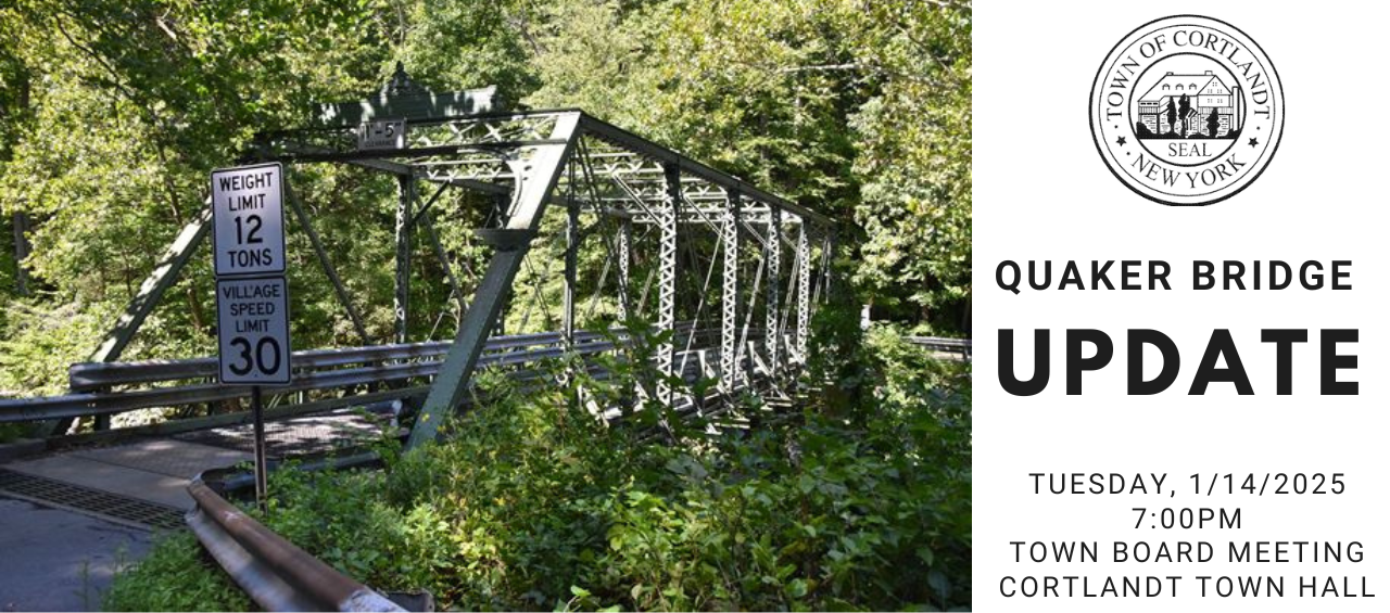 In November 2024 we posted the information below on the Town of Cortlandt website and on the weekly newsletter. The Town Board and I have had a number of meetings with County Elected officials and members of the County staff. I am pleased to announce that Westchester County Executive Ken Jenkins will be coming to Town Hall on Tuesday, January 14th at 7PM with members of his staff to answer resident questions with respect to the closure of the Quaker Bridge. All members of the public are invited to attend to hear the new update and to ask questions. In advance of the meeting, we are asking members of the public to submit questions in order to have the county staff review and to have the most update information. Please send questions to supervisor@townofcortlandt.com. Thank you.