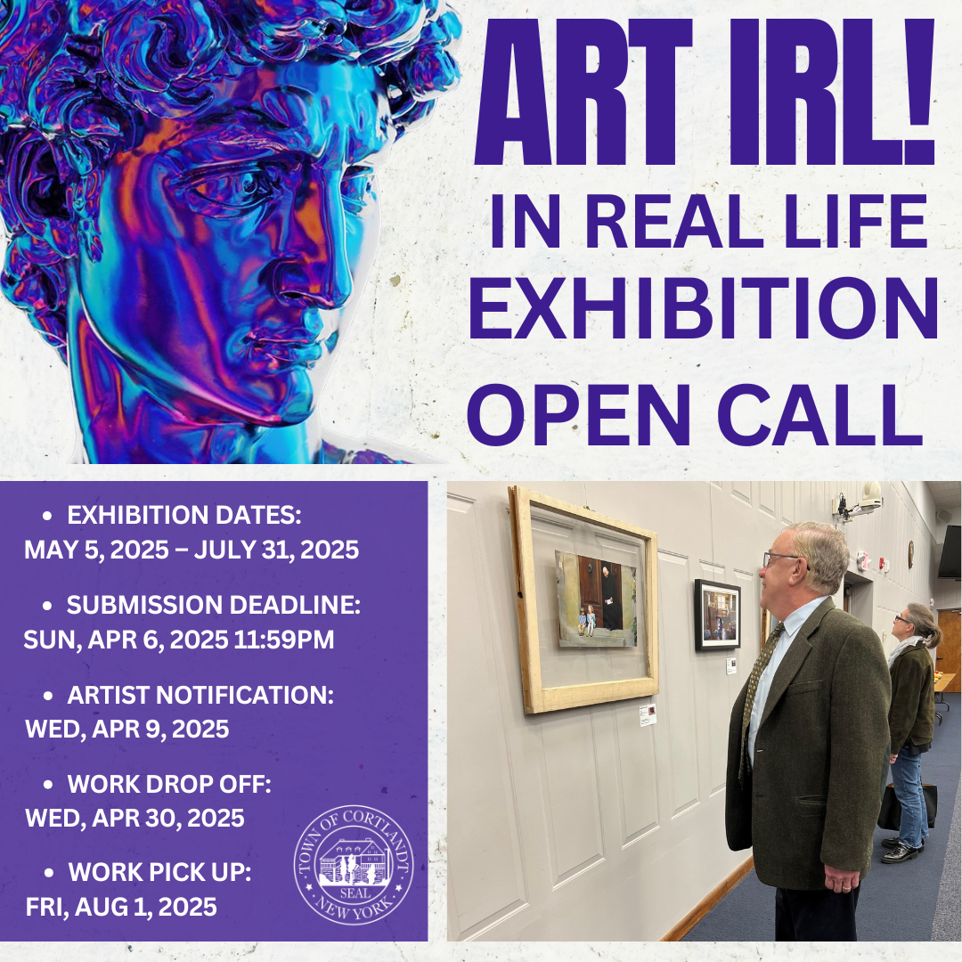 Calling all artists with studios in or residing within the Town of Cortlandt! Submit up to 5 works in all mediums for the exhibition: Art IRL!, to be displayed in the Vincent F. Nyberg General Meeting room and at the hallways Town Hall. This exhibition is an exploration of works “in real life” from artists who use digital tools in their creative process. Questions? Email our art curator, Eren Johnson at art@townofcortlandt.com.