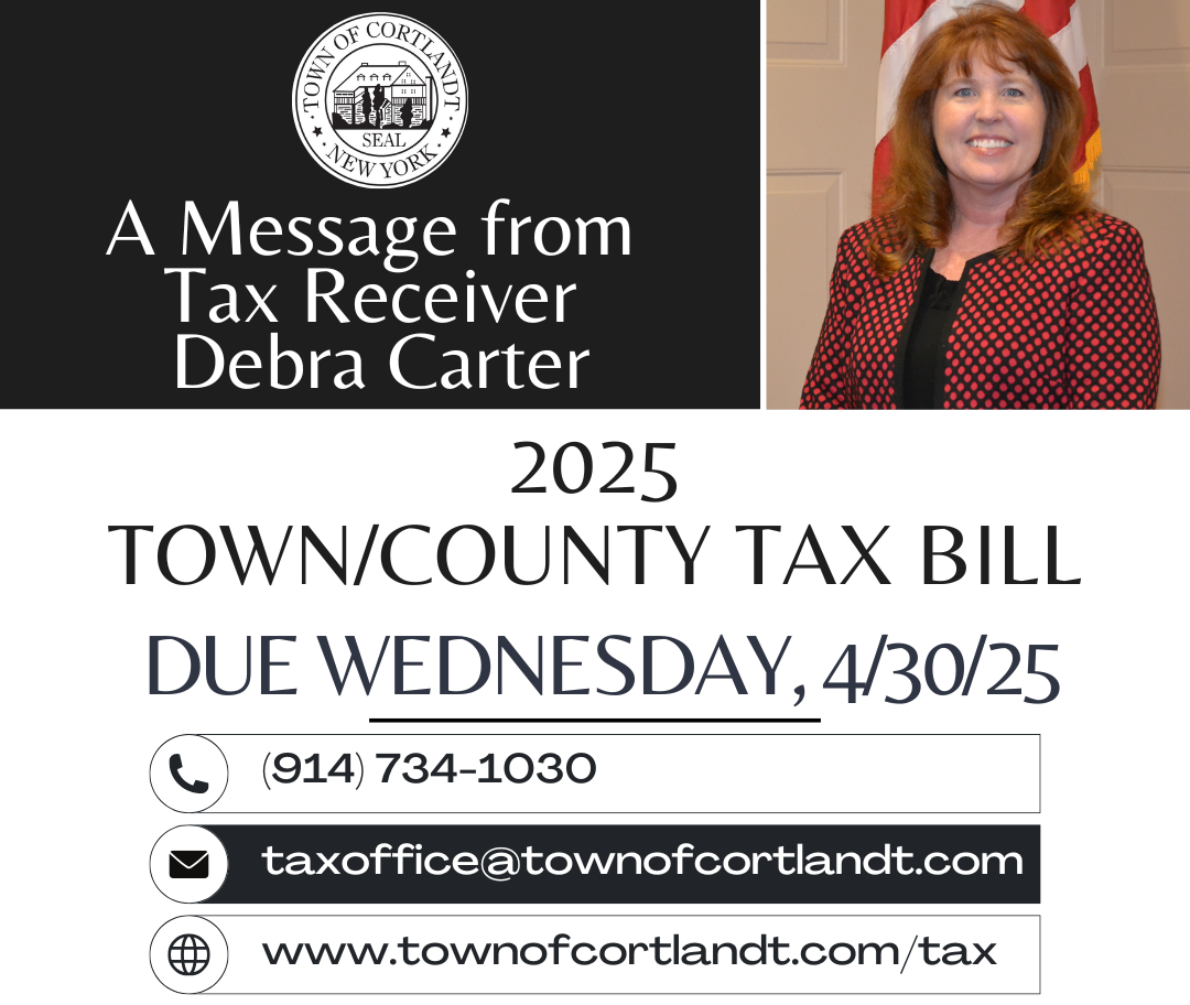Receiver of Taxes Debra Carter and her staff have prepared and mailed out the 2025 General Tax Bills. The tax bill is due on or before Wednesday, April 30, 2025. Taxes that are not paid or have a valid USPS postmark by 4/30/25 will incur a penalty set by New York State.