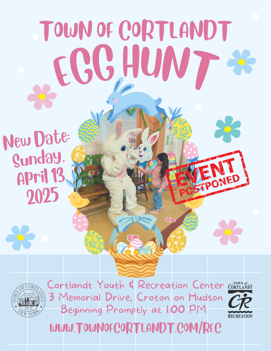 Due to the impending rain in the forecast, the Town of Cortlandt Egg Hunt scheduled for tomorrow, Saturday, April 12th has been postponed to Sunday April 13th at 1:00pm promptly at the Cortlandt Youth Center, 3 Memorial Drive, Croton-On-Hudson.