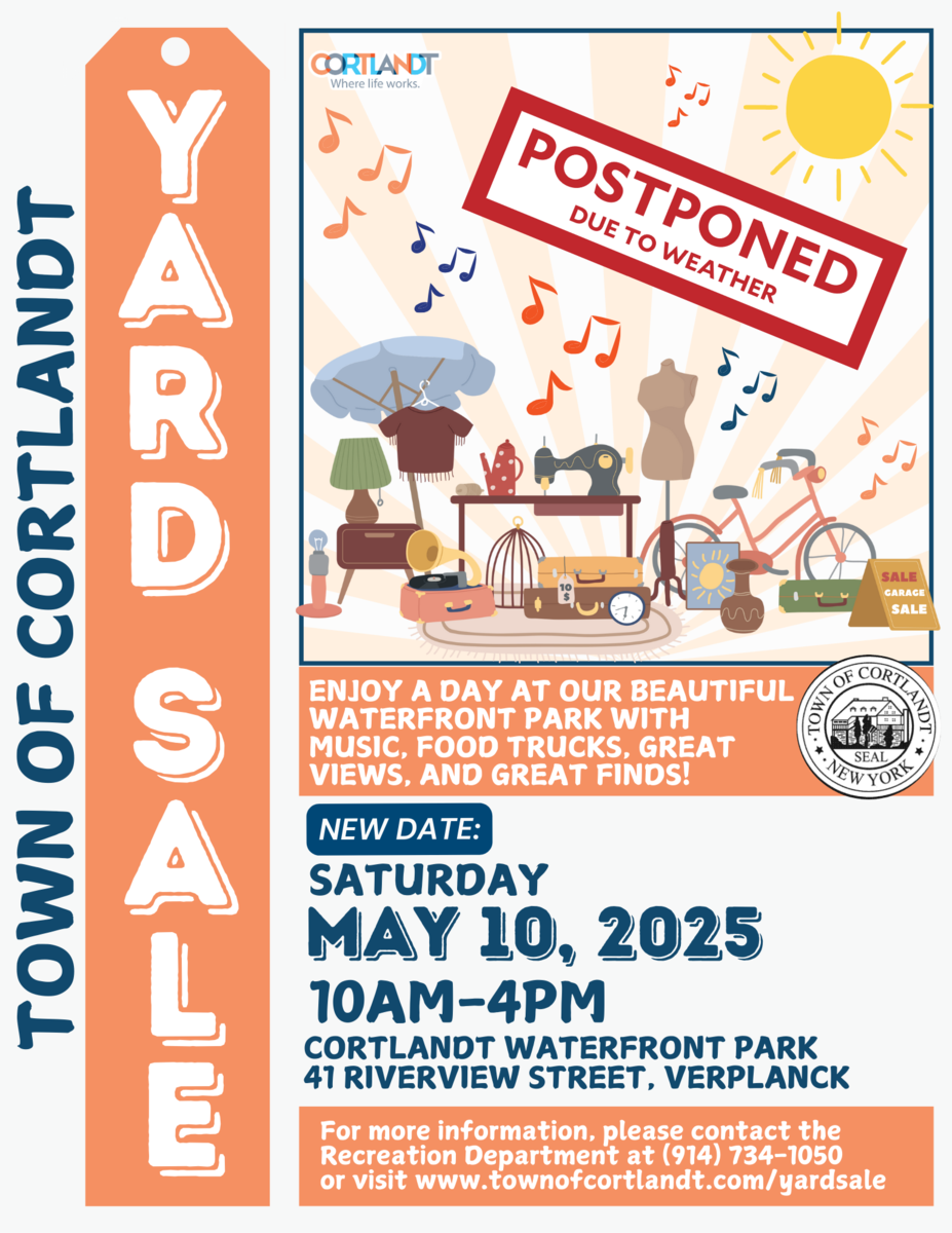 Due to the impending weather, the Town of Cortlandt has made the decision to postpone the Community Yard Sale originally scheduled for tomorrow, Saturday, May 3rd from 10:00 AM to 4:00 PM at the Cortlandt Waterfront Park.