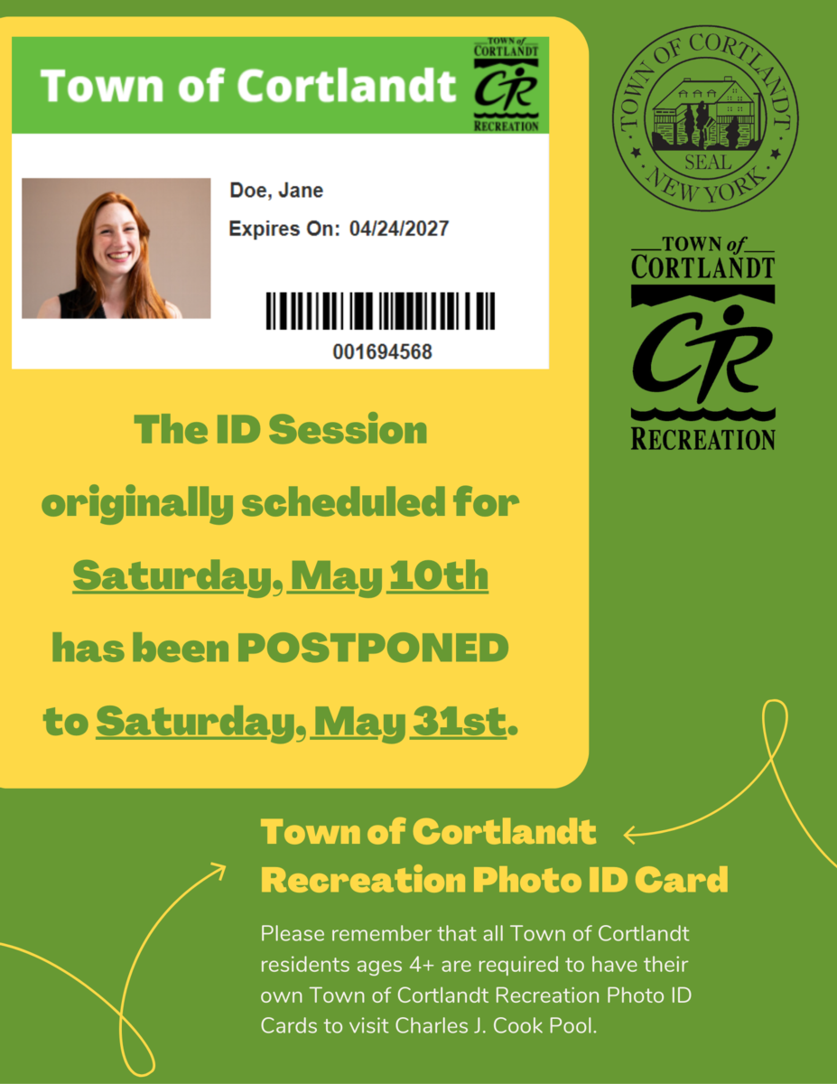 The Recreation Photo ID Session originally scheduled for Saturday, May 10th has been POSTPONED to Saturday, May 31st from 10:00 AM- 1:00 PM.