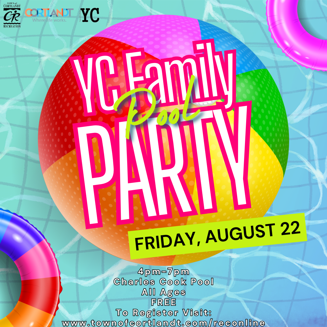 Registration begins today for the YC Family Pool Party!  Families and youth are invited to an end of summer party at Charles Cook Pool. There will be music, games, contests and prizes! Children must be accompanied by an adult, All pool rules apply.