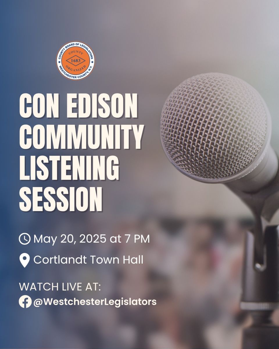 Make your voice heard about Con Ed's outrageous double-digit rate hikes at the Board's first Community Listening Session on Tuesday, May 20th at 7PM. Cortlandt Town Hall 1 Heady Street Cortlandt, NY 10567. You'll have the opportunity to share concerns and questions about the proposed increases, which, if approved, would raise average residential bills by 11.4% for electricity and 13.3% for gas by 2026. More sessions will be held across the county over the next few months.