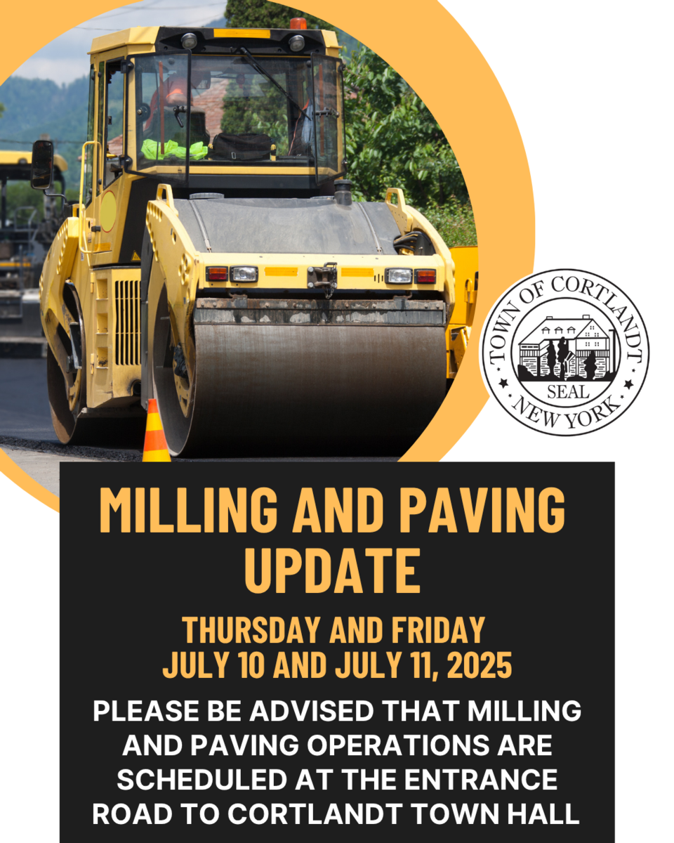 Please be advised that milling and paving operations are scheduled at the entrance road to Town Hall on Thursday and Friday July 11 and 12, 2025. Town Hall will be open to the public, but parking and access will be limited. If possible, we ask that you please seek alternate days to visit or do general business at Town Hall. We appreciate your understanding. The work is weather dependent and is subject to change. If you have any questions please do not hesitate to contact the Town of Cortlandt Engineering division at 914-734-1060.