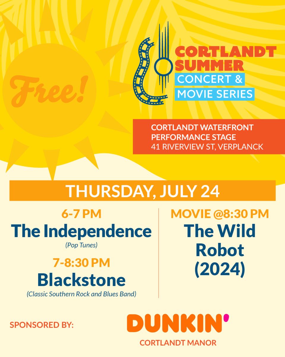 Summer Concert and Movie Alert🍿🎤 Enjoy pop tunes with The Independence band at 6PM at the Cortlandt Waterfront Park, 77 Riverview Ave, Verpanck. Blackstone will take over the stage at 7:00PM and will play classic southern rock and blues. It doesn't end there, stick around after the concert and watch a free outdoor movie featuring The Wild Robert (2024) starting at 8:30PM! This family-friendly event is sponsored by Cortlandt Manor Dunkin'.