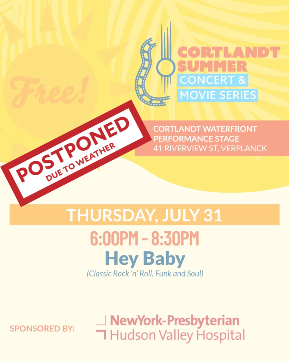 🚨🌧️Due to the weather forecast, the concert scheduled for tonight, Thursday, July 31st, has been postponed to Friday, August 15th at 6PM with the Hey Baby band.