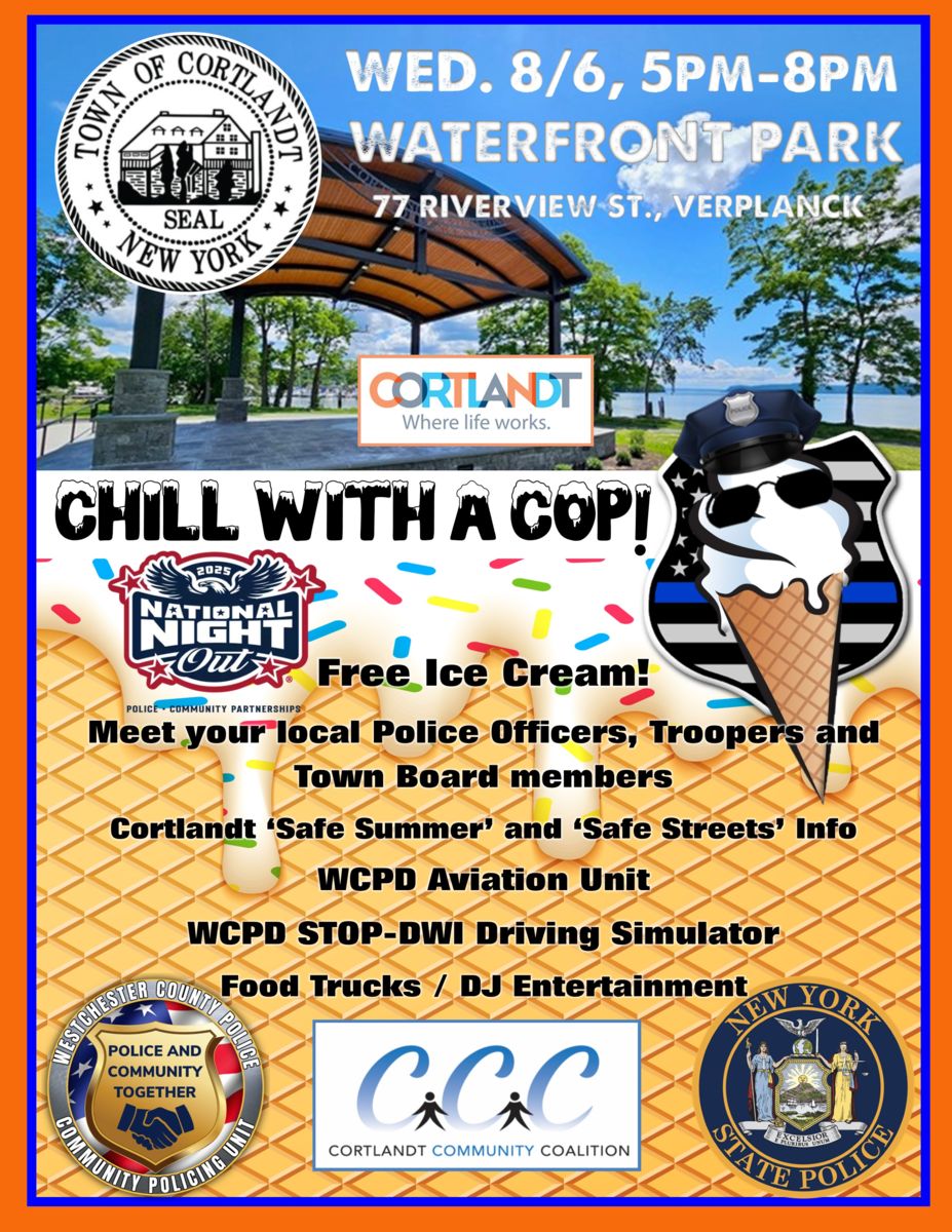 In Cortlandt, residents are invited to come and “Chill With a Cop” at the Cortlandt Waterfront Park in Verplanck from 5 to 8 p.m. There will be free ice cream and lots of fun activities. A DJ and food trucks will be on hand, and the Aviation Unit helicopter is expected to drop in on the festivities.