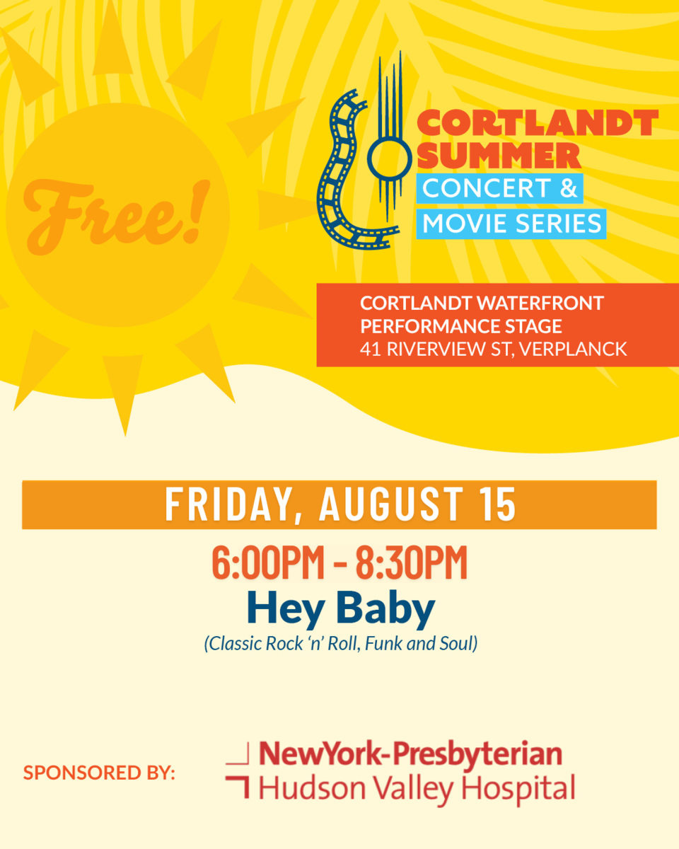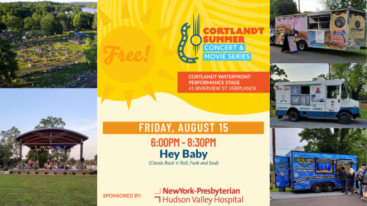 Don’t miss the last summer concert of the season on Friday, August 15 from 6:00 PM – 8:30 PM at the Cortlandt Waterfront Performance Stage, featuring Hey Baby band! Grab your chairs, blankets, and your favorite people for an unforgettable evening of live music! Let’s close out summer with a bang!