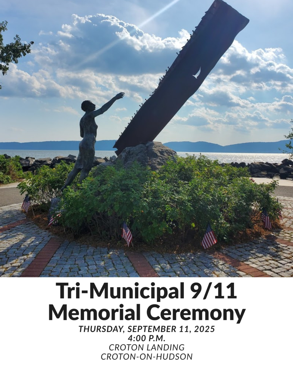 Please join the Village of Buchanan, the Town of Cortlandt, and Village of Croton-on-Hudson in honoring the family, friends, and neighbors we lost on 9/11. The ceremony will take place at 4:00 p.m. on Thursday, September 11, 2025 at the “Reaching Through the Shadow” Memorial at Croton Landing Park in Croton-on-Hudson. A shuttle van from the Village of Croton will be available in the parking area to transport those who need assistance.