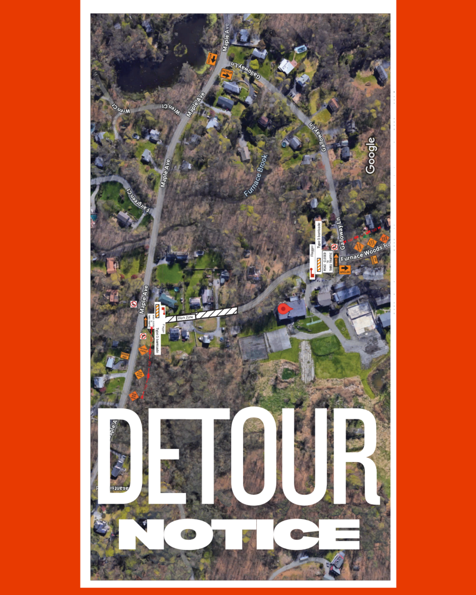 Please be advised that a temporary road detour will be in place on Furnace Woods Road between Galloway Lane and Maple Avenue…Monday September 15 thru Friday September 19 during the daytime hours of 8 am to 4 pm daily. This work is weather dependent and scheduling is subject to change.
