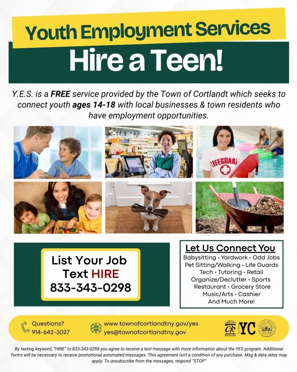 Hire a Teen! The Town of Cortlandt’s Youth Employment Services (Y.E.S.) can help you find local high school students ages 14-18 who want to work short or long term. Looking for a date night babysitter? Someone to walk your dog or feed your pets while you’re away? Help with yard work? Let us know the details of your job and we’ll help connect you. Your personal information is kept private, and we only give your application instructions to those expressing the desire to apply.