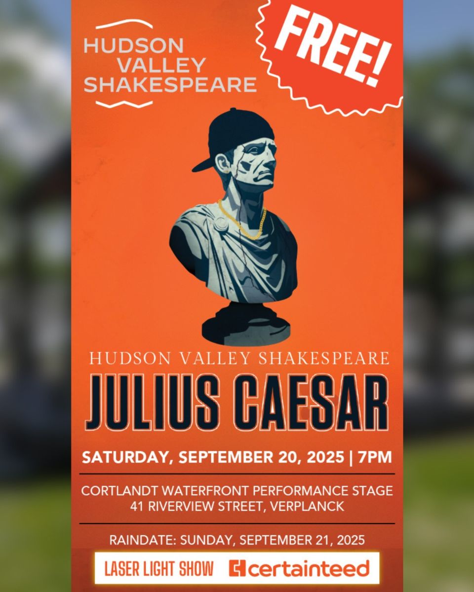 Shakespeare in the Park is right around the corner! Enjoy a FREE night of theatre performance of Julius Caesar by the Hudson Valley Shakespeare on Saturday, September 20th at 7:00PM at the Cortlandt Waterfront Performance Stage located at 41 Riverview Street in Verplanck!