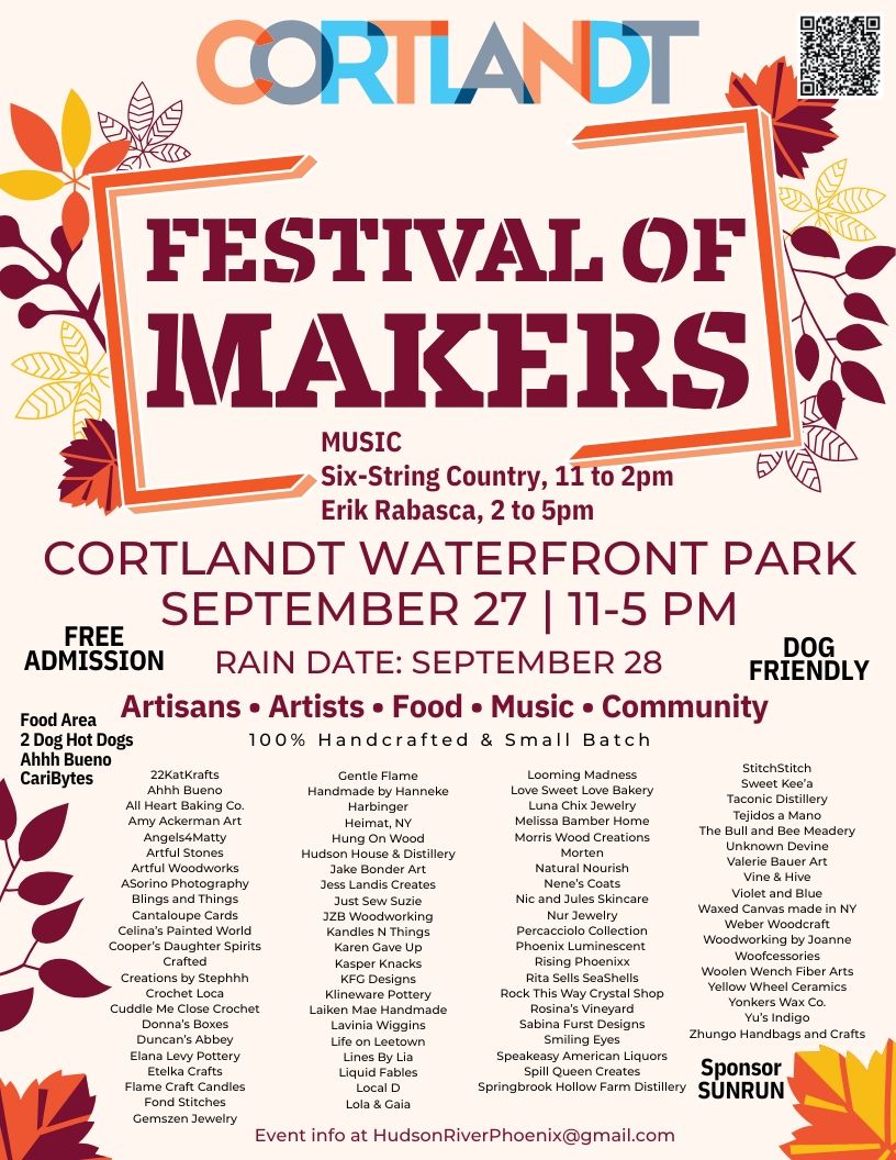 The Festival of Makers will feature over 90 exhibitors along with food trucks and live music happening Saturday, September 27th from 11am–5pm at Cortlandt Waterfront Park located at 41 Riverview Street in Verplanck! This exciting event showcases handmade jewelry, art, and goods from local artisans. It’s the perfect chance to shop unique crafts, meet the makers behind the creations, and soak up the vibrant atmosphere of creativity and community.