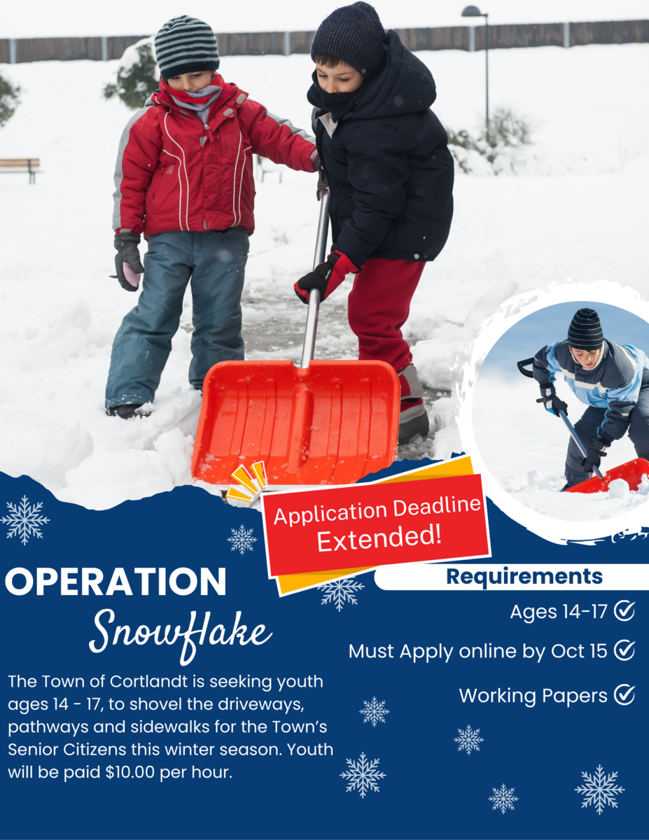 The Town of Cortlandt is seeking youth ages 14-18 to shovel driveways, pathways and sidewalks for the Town’s Senior Citizens this winter season. Youth will be paid $10 per hour. Extended application deadline is Wednesday, October 15th.