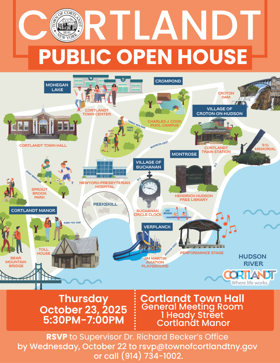 New to town and have some questions? Moved to town long ago and still curious or looking for new information? Join us for our Public Open House event on Thursday, October 23, 2025 at 5:30PM until 7:00PM in the Vincent F. Nyberg General Meeting Room in Cortlandt Town Hall located at 1 Heady Street in Cortlandt Manor. Stop by to learn more about our town government and all it has to offer to our residents! Please RSVP by Wednesday, October 22 to rsvp@townofcortlandtny.gov or call (914) 734-1002 for more information. Light refreshments will be provided.