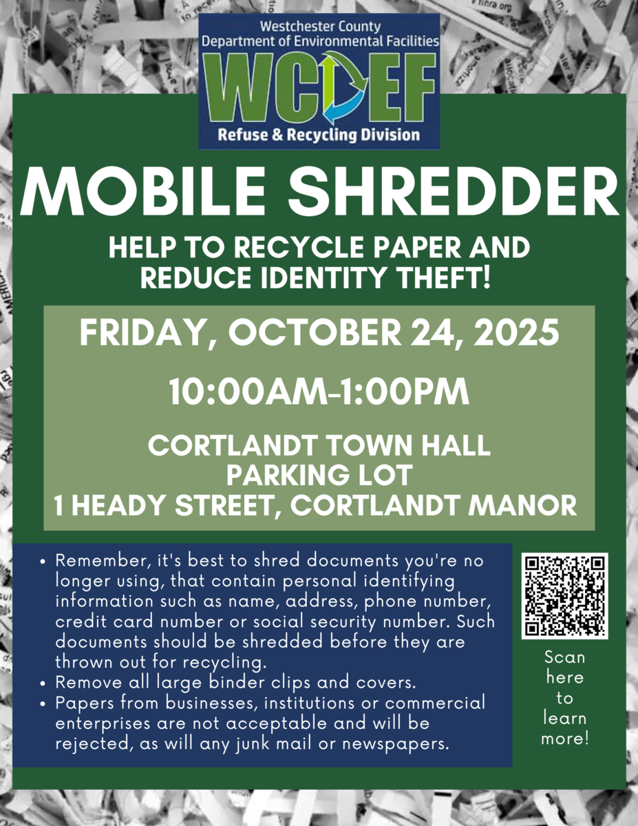 Who's ready to shred? The Mobile Shredder will be coming to the Town of Cortlandt! Visit Westchester County Department of Environmental Services website or call the Recycling HelpLine at (914) 813-5425 for more information.