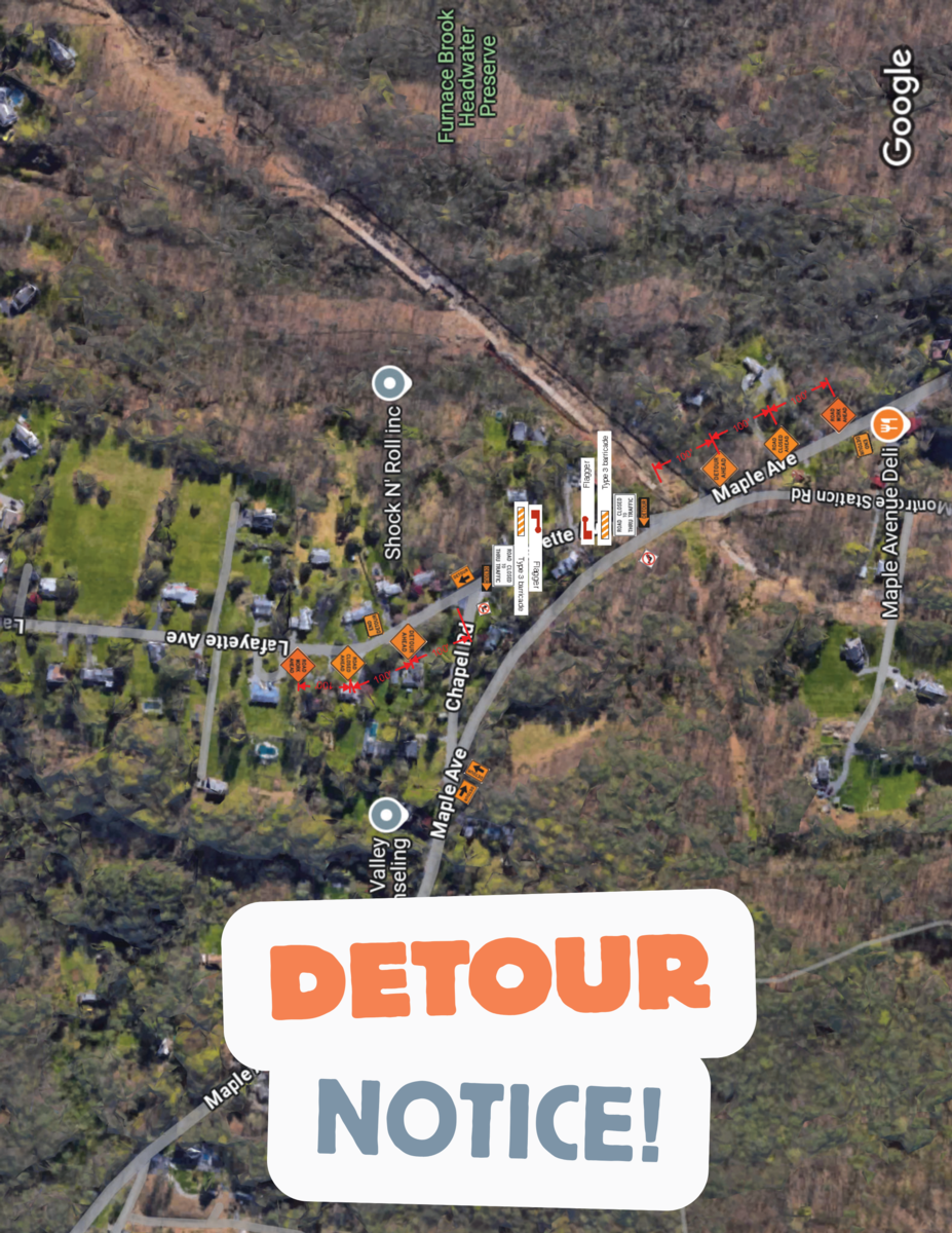 Please be advised that a temporary road detour will be in place at the intersection of Lafayette Road and Maple Avenue, between Maple Avenue and Chapel Road…Wednesday November 5 thru Friday November 7, 2025 during the daytime hours of 7:30 am to 4 pm daily. This work is weather dependent and scheduling is subject to change.