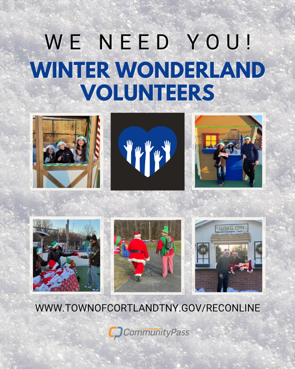 We are looking for individuals, sports teams, clubs & organizations that are interested in volunteering for the Town of Cortlandt at our Sixth Annual Winter Wonderland on Saturday, December 13th from 2:45 PM- 6:00 PM!