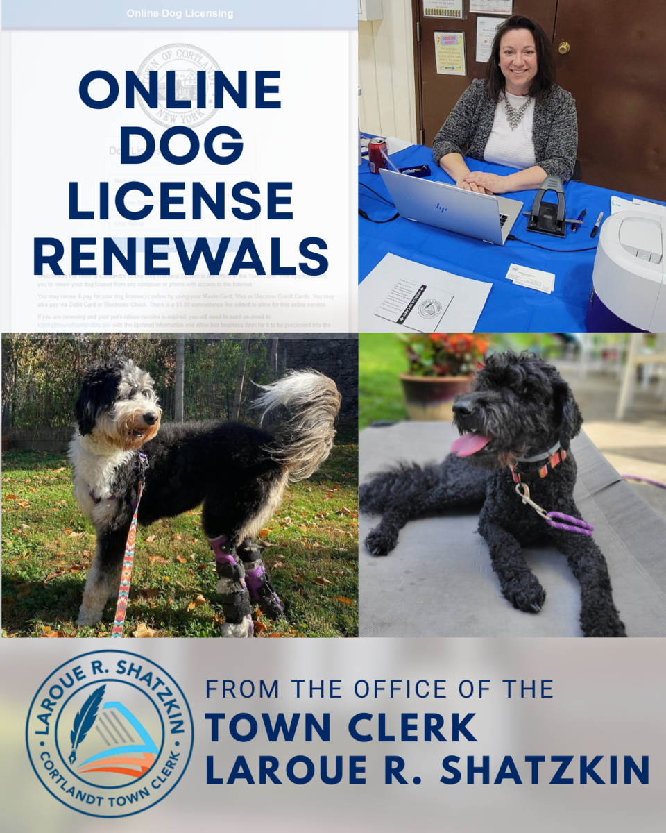 You can link to the service online at www.townofcortlandtny.gov/townclerk under Dog License Renewals. This upgrade is designed to help residents comply with New York State Law more easily. All dogs are required to be licensed in the Town in which they reside. Please feel free to call the Town Clerk's Office at 914-734-1020 with any questions.