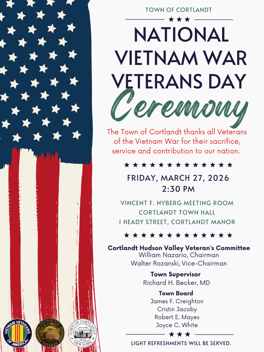 Let's come together to pay tribute to the brave men and women who served our country during the Vietnam War. Join us in the Vincent F. Nyberg General Meeting Room in Cortlandt Town Hall, on Friday, March 27th at 2:30 PM. Light refreshments will be served.