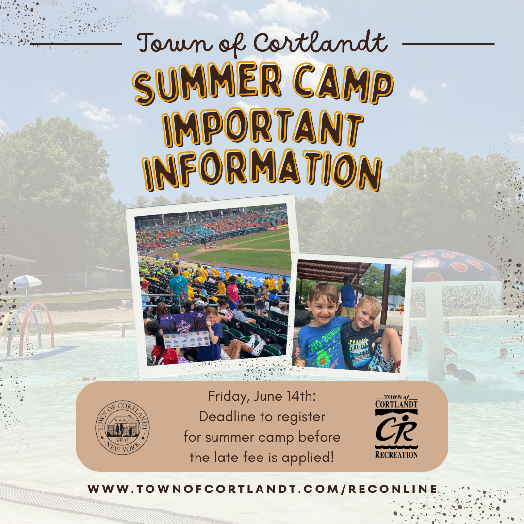 Only ONE WEEK until the deadline to register for the 5th/6th Grade Camp, the 7th/8th Grade Camp, and Day Camp online and before the LATE FEE is applied! Register today at www.townofcortlandt.com/reconline