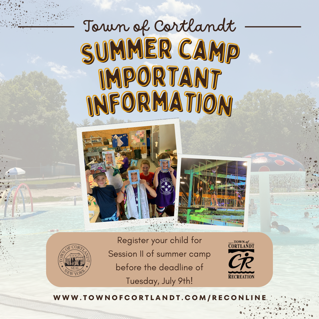 Make sure to register your children for session II of summer camp before the deadline of Tuesday, July 9th! For any questions or concerns, please contact the Town of Cortlandt Recreation Department at tocrec@townofcortlandt.com or 914-734-1050.