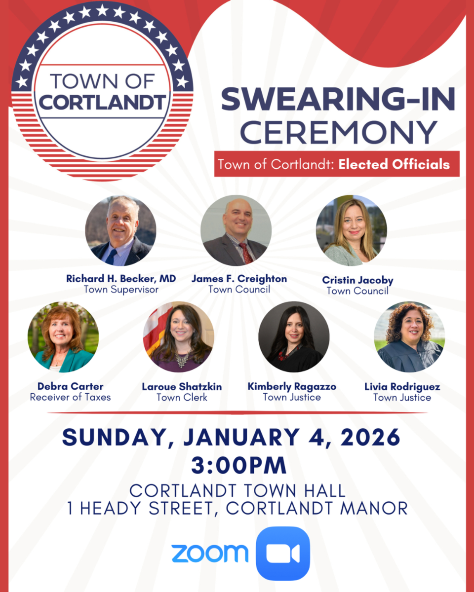 The Swearing-In Ceremony for Town of Cortlandt elected officials on Sunday, January 4th at 3PM at Cortlandt Town Hall. The ceremony will also be available to watch via Zoom.