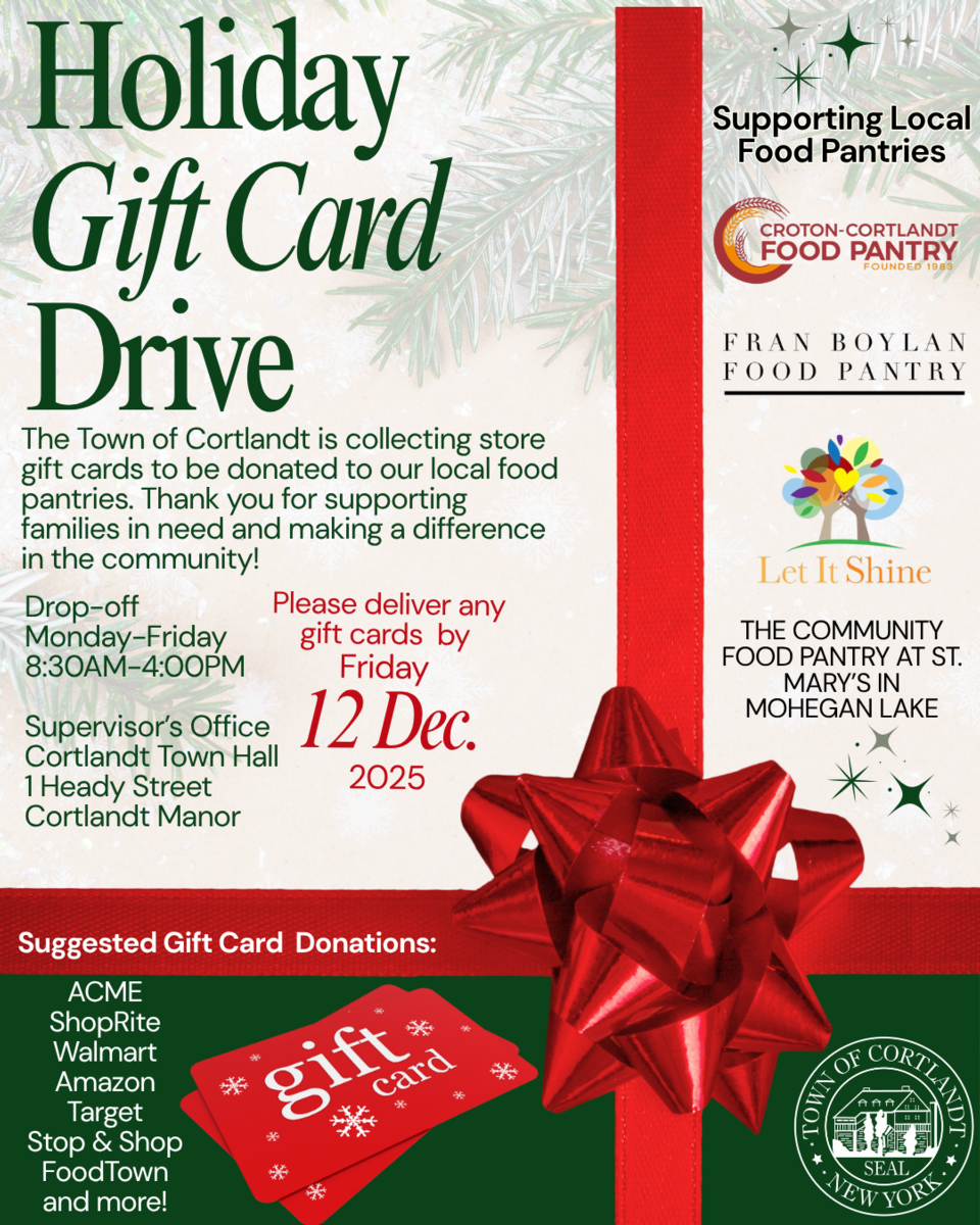 ๐‘Tis the season of giving! The Town of Cortlandt is collecting gifts cards that will go to support families in need in our community. We'd love your support!