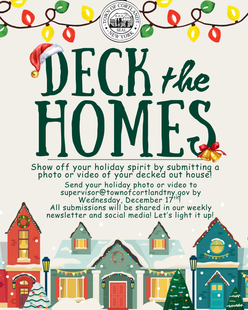 Deck the homes✨ Show off your holiday spirit by submitting a photo or video of your decked out house! Send your holiday photo or video to supervisor@townofcortlandtny.gov by Wednesday, December 17th!