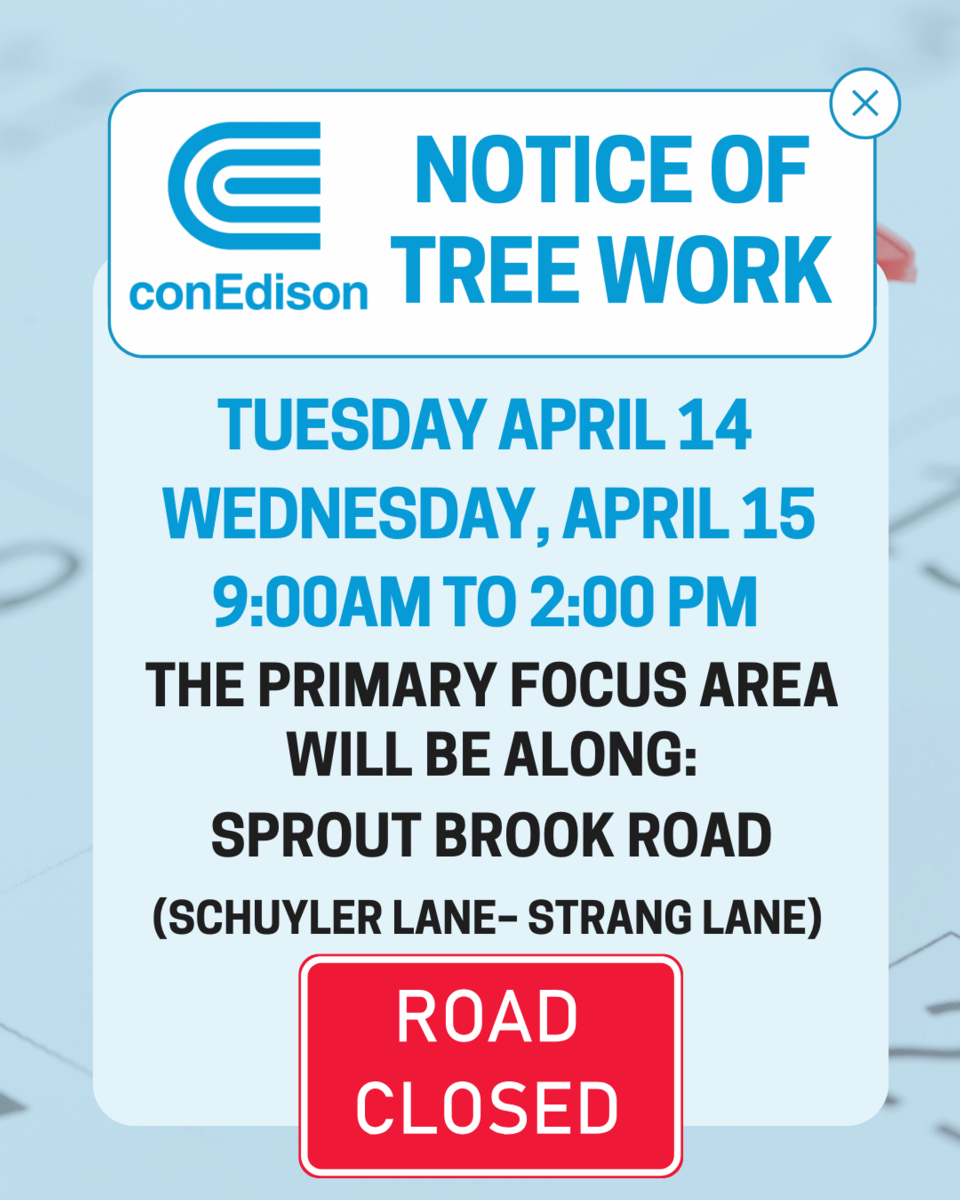 Con Edison will be closing Sprout Brook Rd (Schuyler Ln – Strang Ln) Tuesday April 14 and Wednesday, April 15, 2026 for tree work.