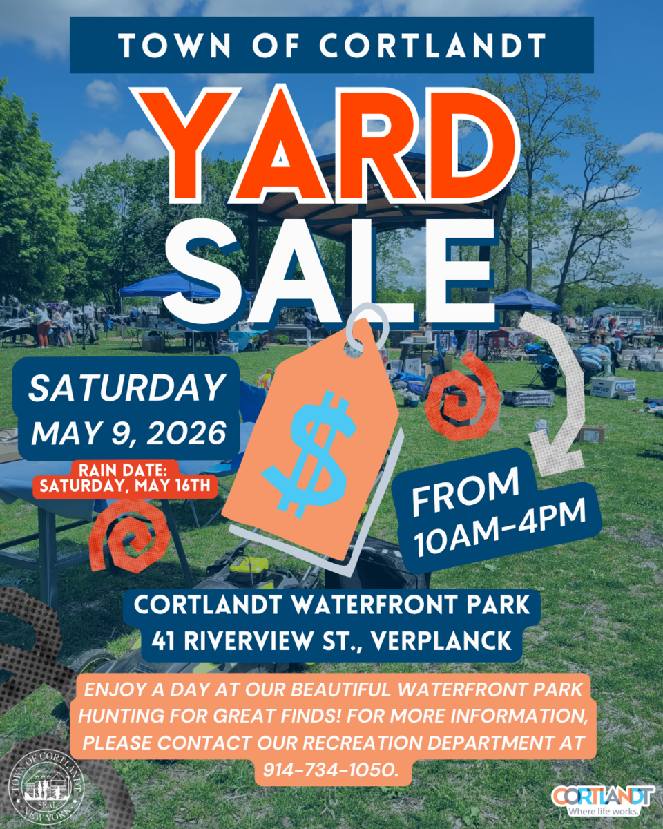 Join your neighbors for a day of shopping and fun at our beautiful Cortlandt Waterfront Park located at 41 Riverview Street in Verplanck! 🌳 Our second annual Town Wide Yard Sale is happening Saturday, May 9th, from 10:00 AM to 4:00 PM. Grab a bite from a food truck and hunt for your next favorite treasure!