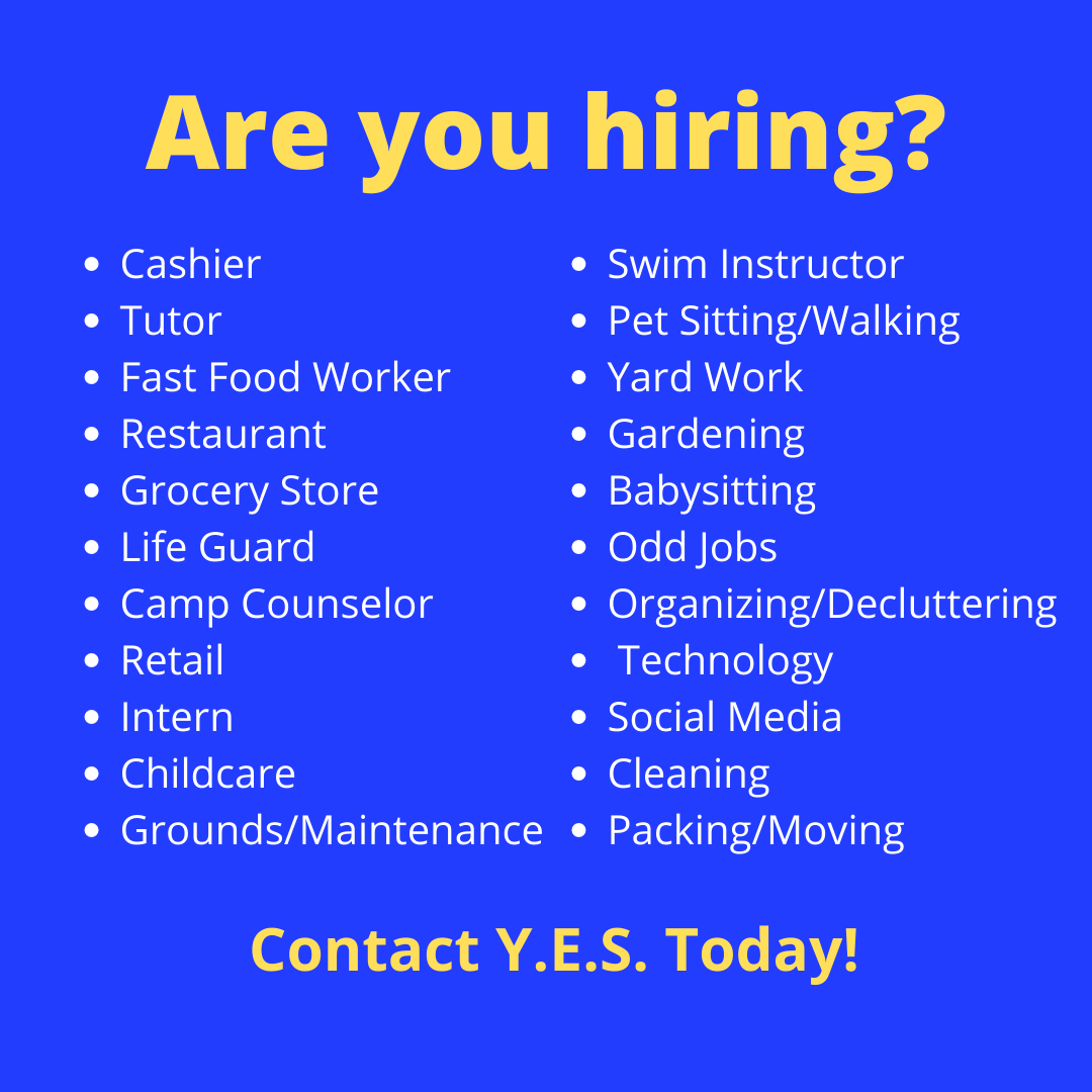 Y.E.S. is a FREE service provided by the Town which seeks to connect youth ages 14-18 with local businesses and town residents who have employment opportunities.